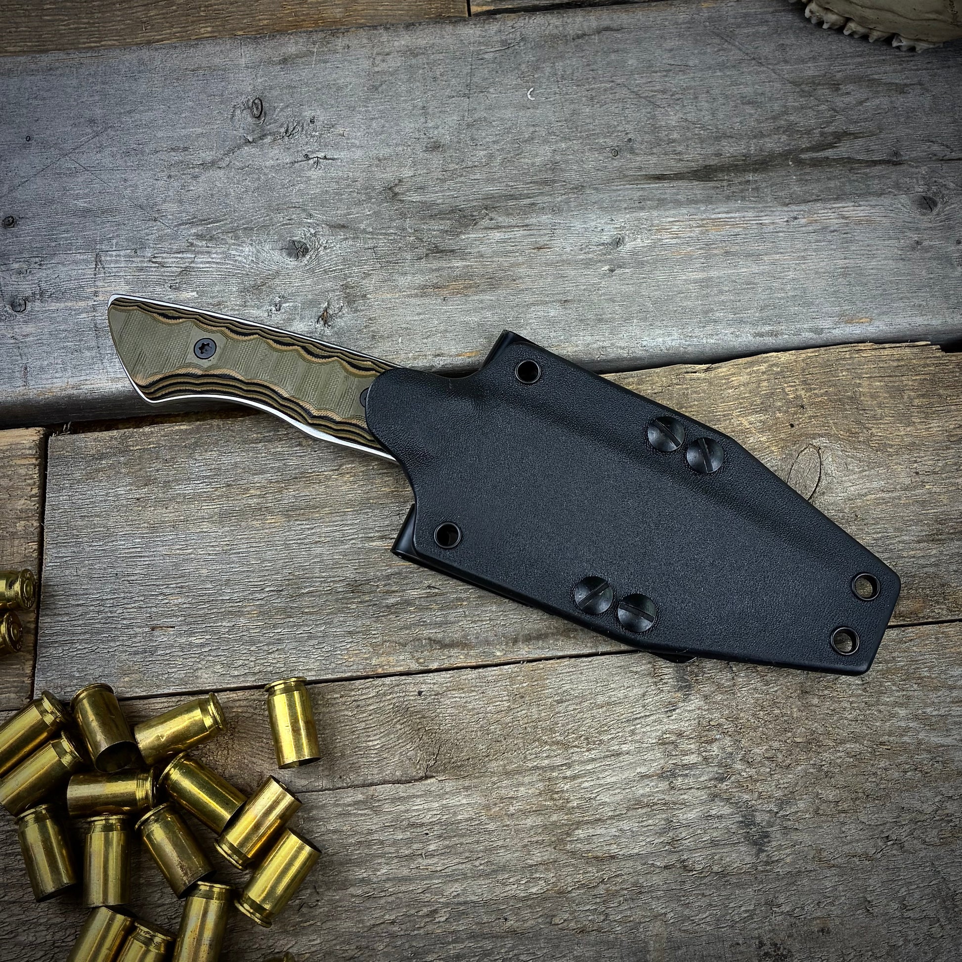 In addition each knife includes a Kydex sheath, with the option to upgrade to a hand tooled leather sheath.