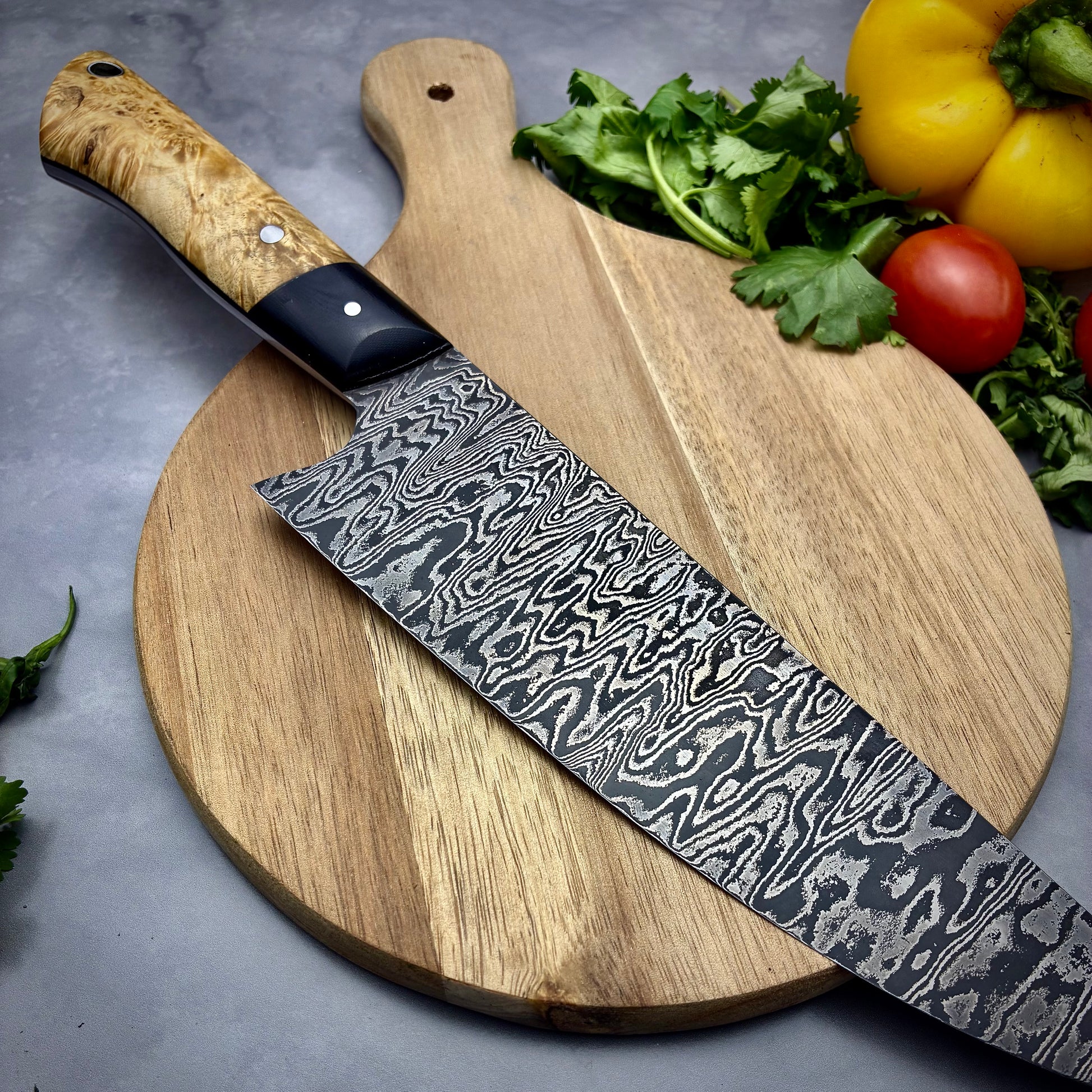 I have two different blades, and the handle of both blades is a full tang construction with a black micarta bolster and stainless pins. One blade features a natural stabilized Manitoba Maple Burl, with Black liners. The other blade features a black Manitoba Maple Burl handle, with brass pins and liners to match the subtle yellow hues of the wood. The handles have been given a high polish and oiled to protect against moisture and to be as enjoyable as possible to use, however a coat of mineral oil is recommended occasionally. In addition there is a lanyard tube in the handle so it is easy to hang up in the kitchen, and is Ferro Magnetic so it will stick to a magnet bar.