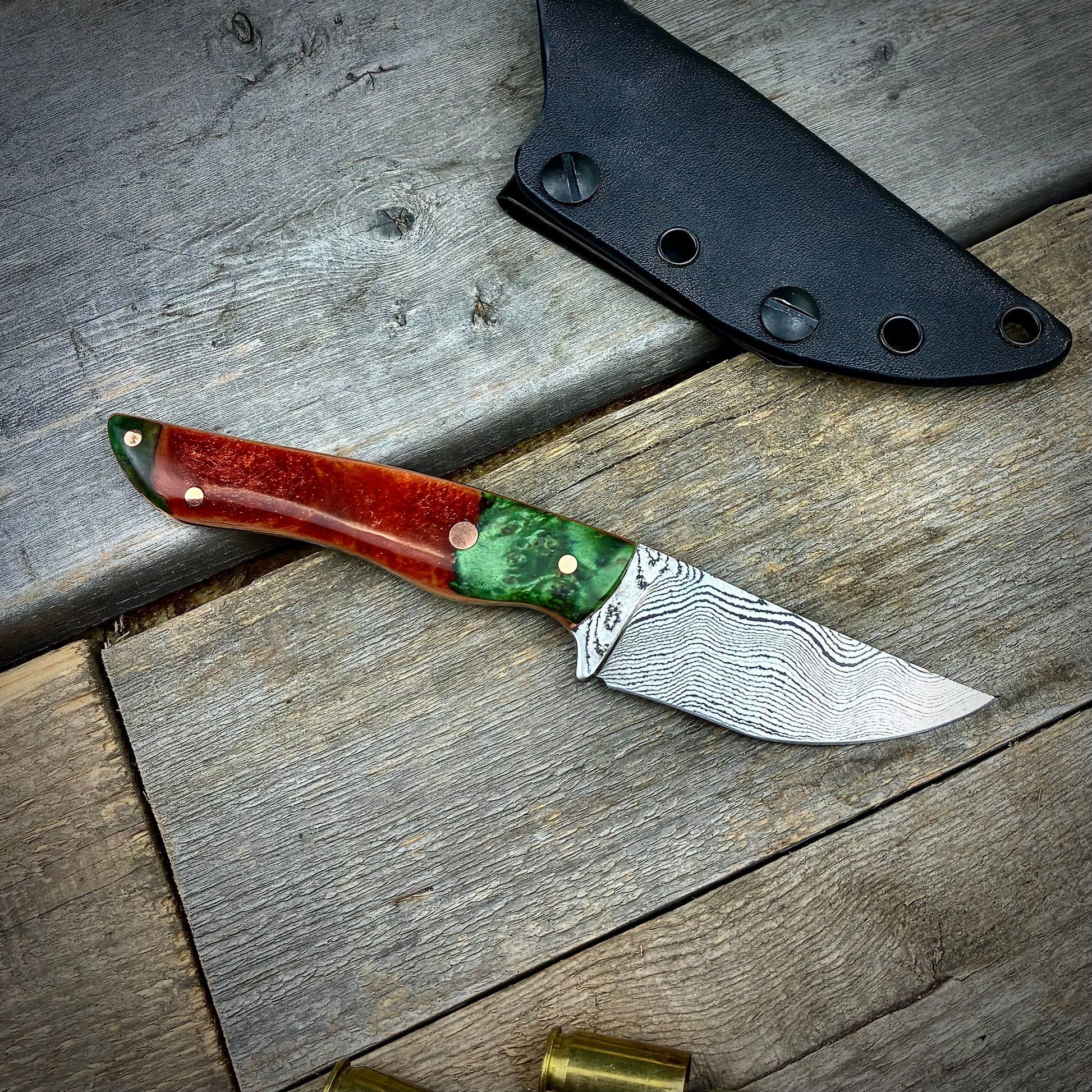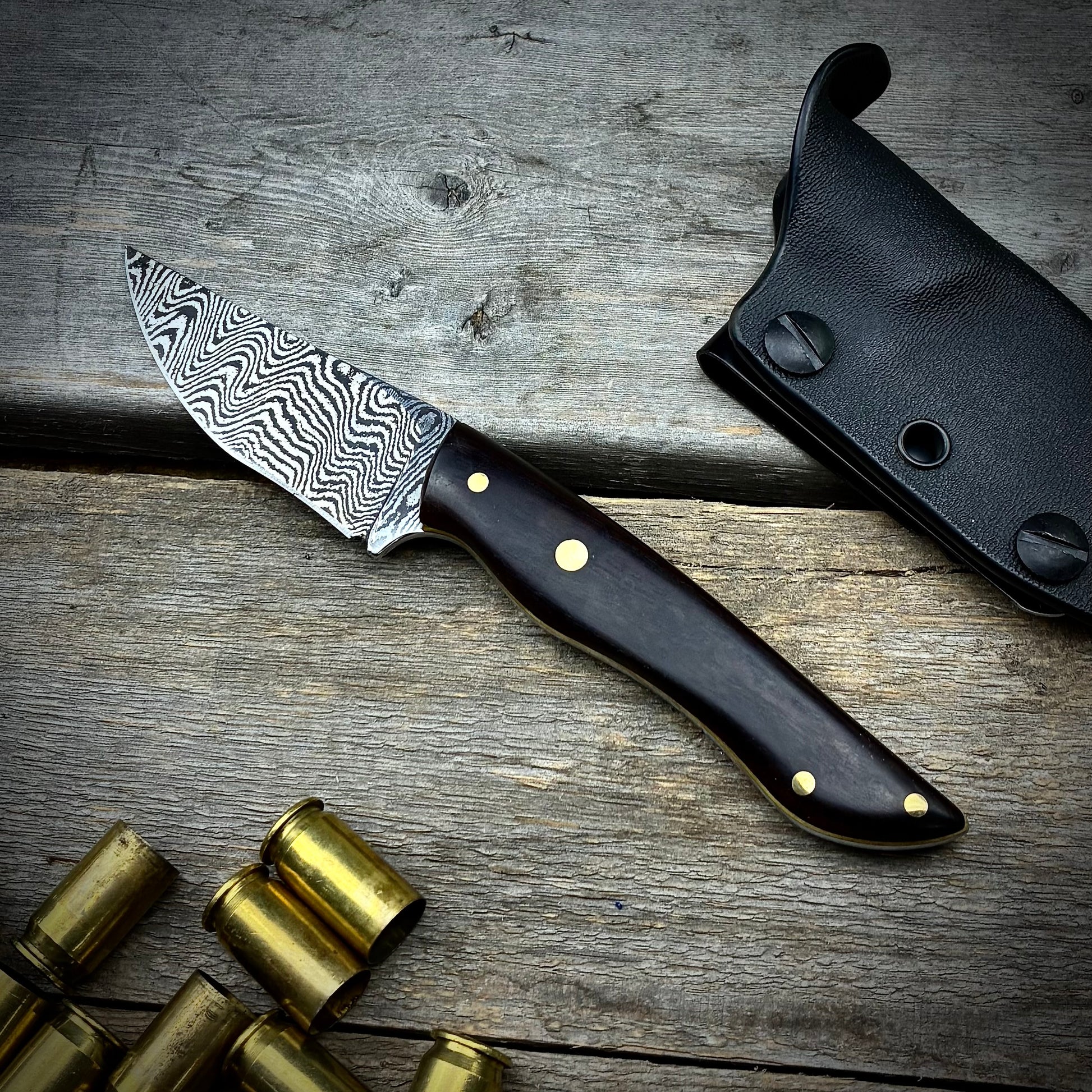 Introducing the EDC V2, hand forged in Canada from premium Damascus Steel! I've taken feedback from users of the EDC knife to create my updated, EDC V2. Furthermore, I've done a limited number of these blades in Damascus Steel. Each blade Is made from around 300 layers of folded 1095 and 15N20 high carbon steel, which have been painstakingly polished and etched to reveal the unique pattern. This knife is built for every day carry as a pocket knife, but also has been designed as a skinning knife for those who like a smaller knife for field dressing.