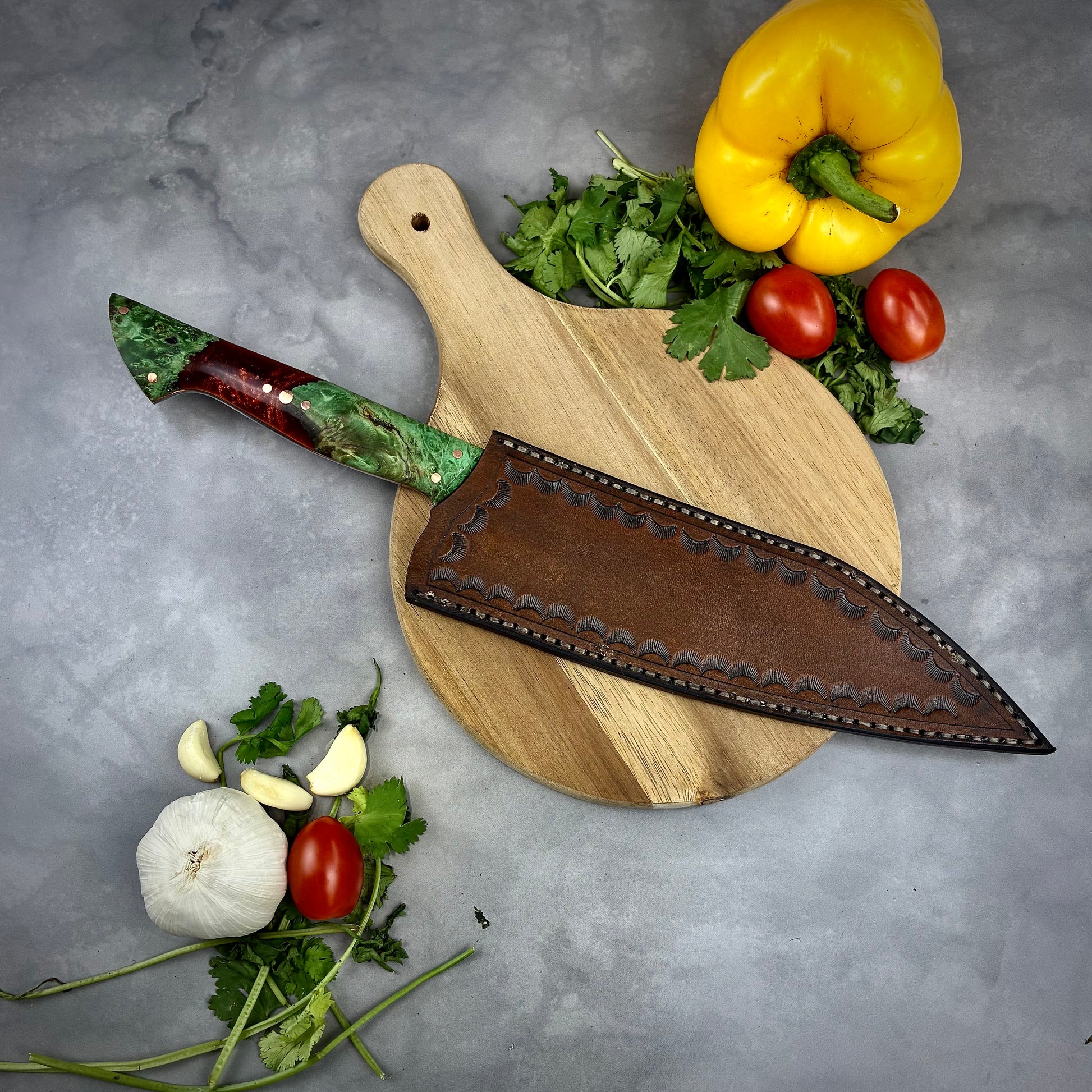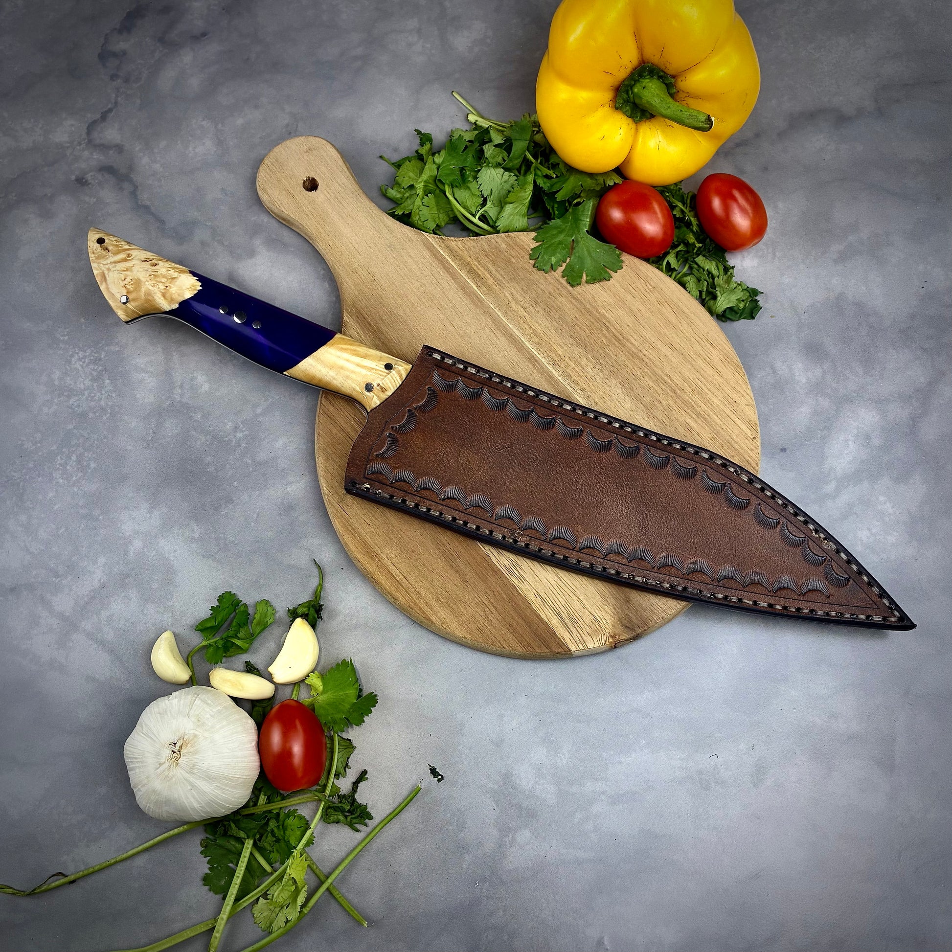 The handle style of this blade is designed with a western style in mind, to ensure comfortable grip for cooks more familiar with traditional European style blades. Besides the comfortable grip, my favourite part of this handle is the wood choice. My favourite wood is locally sourced Manitoba Maple Burl, and for these handles I've featured the ends of the burl, where the bark attaches to the tree and filled it in with epoxy. These handles are my favourites to do, as I'm able to feature parts of trees what would otherwise be scrapped, in a really dramatic way.