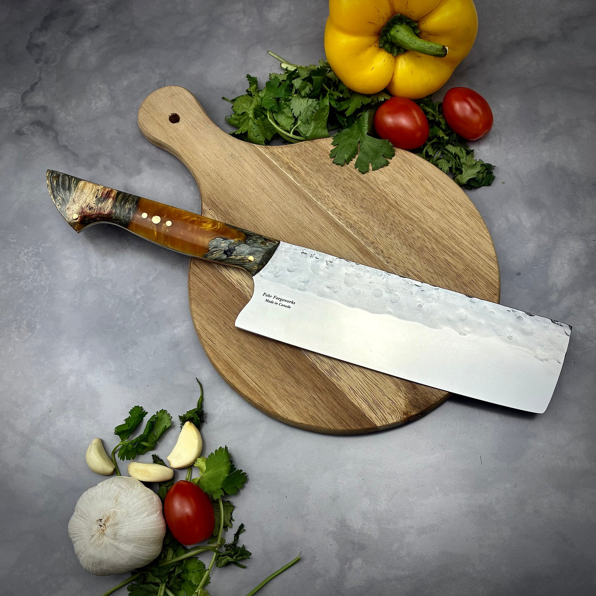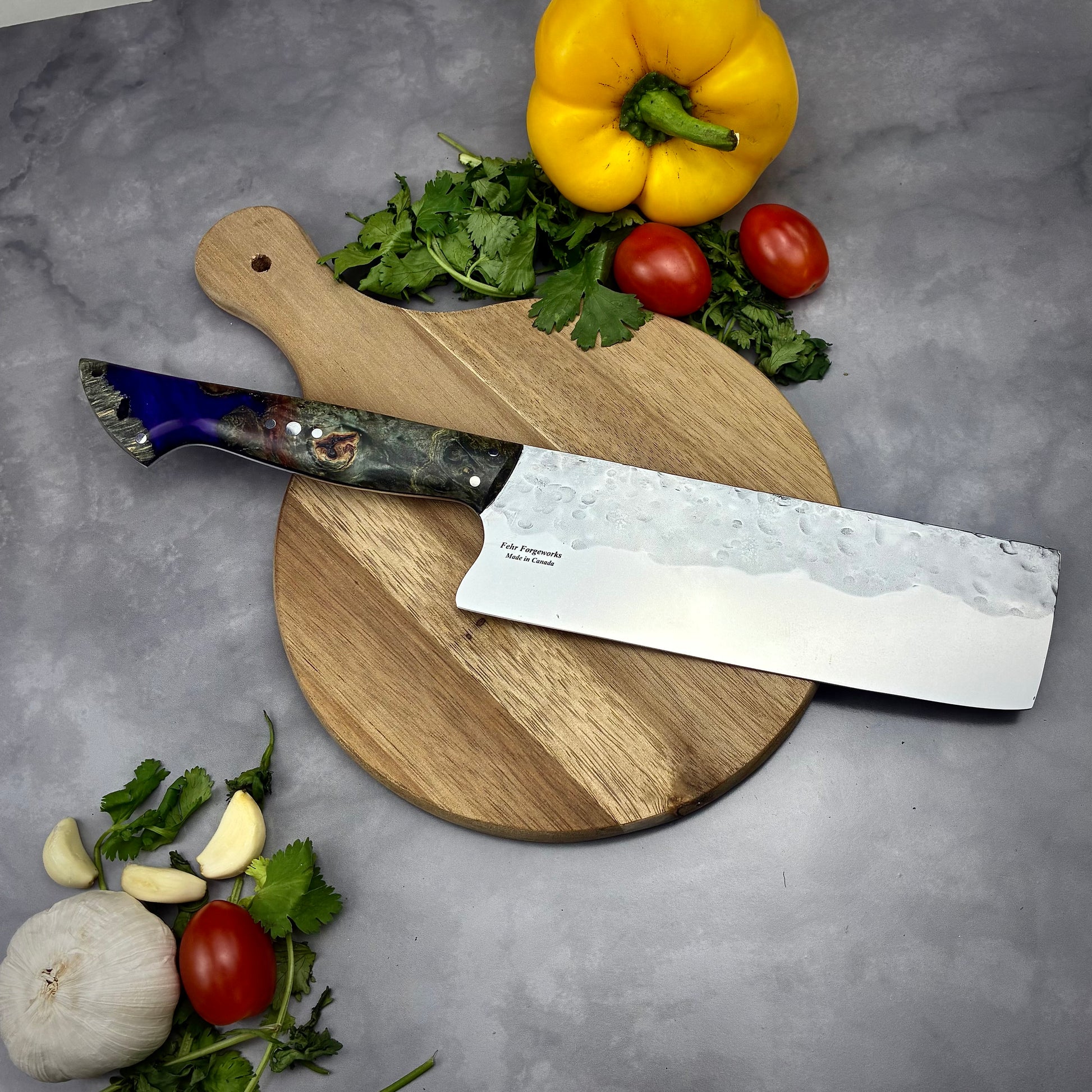 A Nakiri is one of my go to blades in the kitchen. This Japanese blade is designed primarily for vegetables, and the wide, flat blade allows you to quickly and precisely prep your vegetables. My take on the traditional Nakiri includes some features such as a stainless blade for low maintenance use. The blade itself is very thin, with a maximum of 1.5mm stock (1/16') along the spine. This thinness tapers down to a very fine edge, which makes it an excellent fine slicer for detail cuts, making it my go to blade in the kitchen for veggie prep.