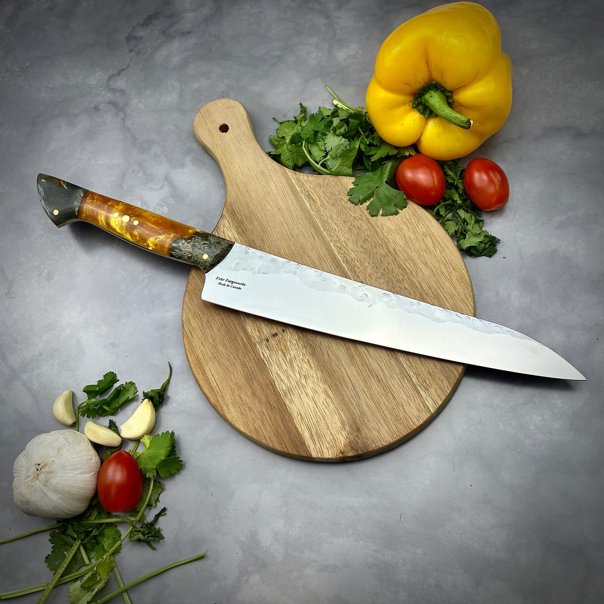 My take on a Japanese style Gyuto comes in the form of a 9" (230mm) slicing blade. akin to a European style chef knife, but has a few distinct differences. My Gyuto has a flatter edge than a 8" chef knife, which promotes more of a chopping action over rocking, however the tip is swept up enough to allow for a little bit of comfortable rocking. However, where this blade excels at is with slicing, perfect for both vegetables as well as meat. Furthermore, the blade itself is thin, made from 1.5mm (1/16') stock. This thinness tapers down to a very fine edge, which makes it an excellent fine slicer for detail cuts.