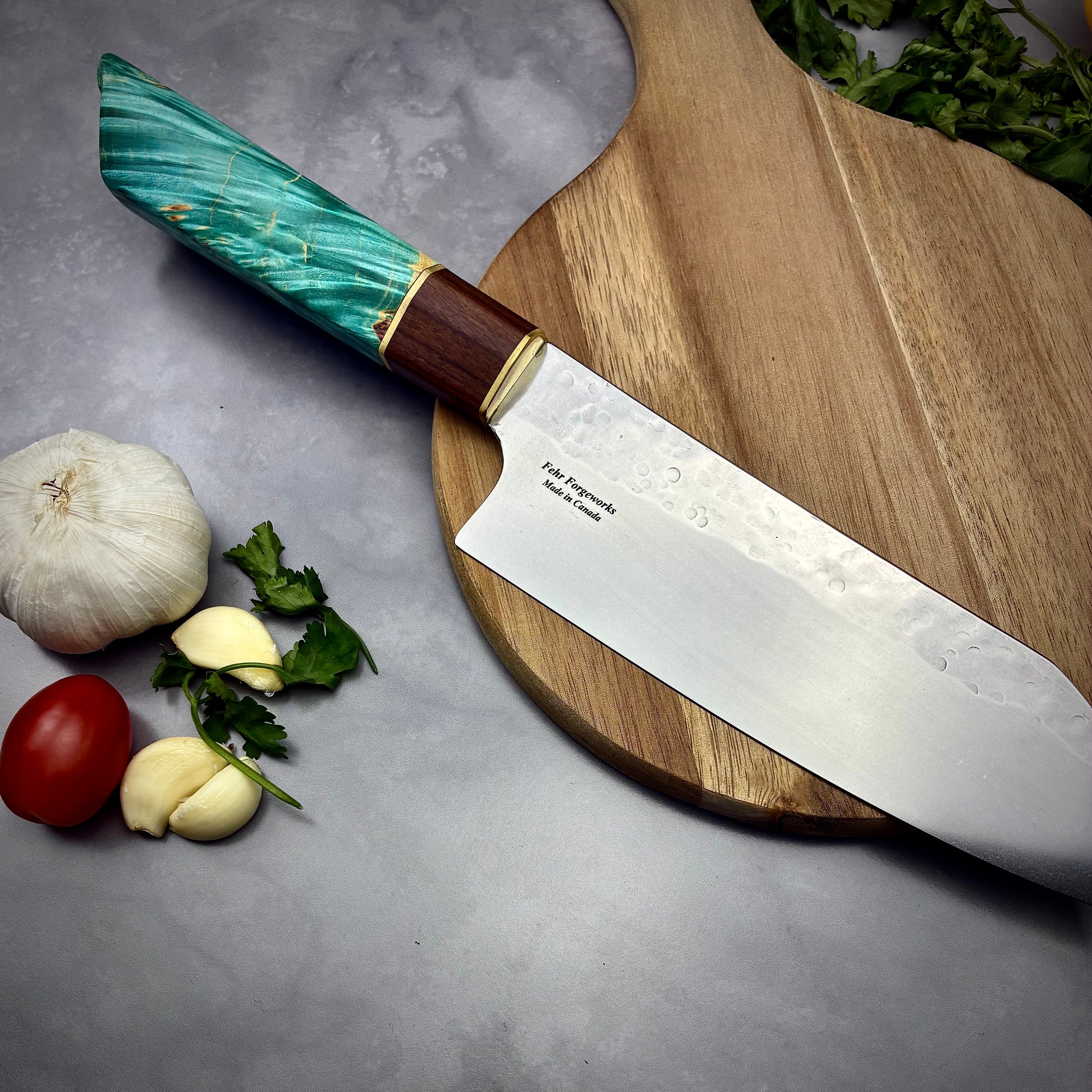 The handle style of this blade is inspired by a traditional octagonal Wa style handle. I've taken inspiration and slightly adjusted some angles of the handle to make the handle taper down towards the blade to allow for slightly better indexing. Besides the comfortable grip, my favourite part of this handle is the wood choice. I've featured some locally sourced Manitoba Maple Burl and impregnated it under vacuum with a blue stabilizing resin to ensure for a lifetime of durability. I specifically featured the live edge of the burl for these handles, as I wanted something totally unique and to be able to feature the junction where the bark attached to the tree.