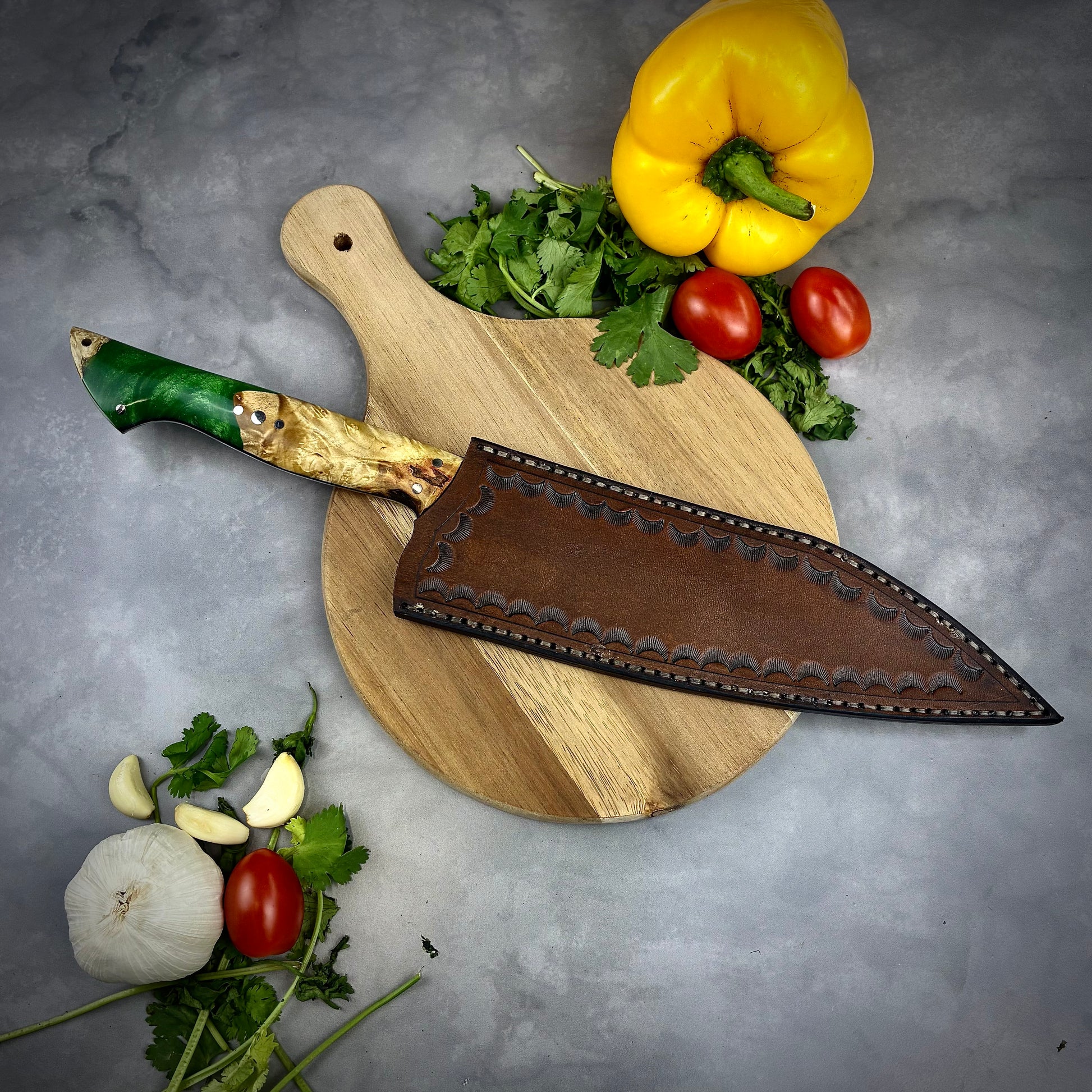 We also offer a hand tooled and stitched leather sheath for storage, custom fitted to the blade to hold it snugly and for ease of use. Note that the photos of the sheath feature a different knife, you will receive the carbon steel chef knife, but with a sheath in the style of the photos.